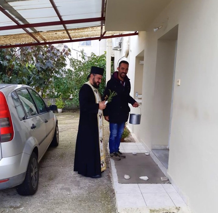Η ευλογία των υδάτων γίνεται μέσα στην εκκλησία, πάνω σε στολισμένη από κλαδιά μικροεξέδρα, όπου έχουν τοποθετηθεί αγγεία με νερό. Μετά το τέλος της λειτουργίας, ο ιερέας θα πάρει από το αγιασμένο αυτό νερό (τον αγιασμό) και θα βγει στα σπίτια και στα μαγαζιά της ενορίας του, «ν’ αγιάσει» και να διώξει το κακό. Ένας μικρός ή άλλος εκκλησιαστικός βοηθός του κρατά το σικλί (χάλκινο συνήθως δοχείο με τον αγιασμό) και ο παπάς, φορώντας μόνο πετραχήλι και κρατώντας την αγιαστούρα (δέσμη βασιλικού μετά του Σταυρού), ραντίζει εδώ κι εκεί, ψάλλοντας το «Εν Ιορδάνη», το τροπάριο των Θεοφανίων. Όλοι όσοι δέχονται τον αγιασμό προσφέρουν τον οβολό τους, συνήθως κέρματα, τα οποία συγκεντρώνει ο βοηθός του ιερέα.