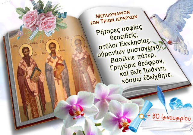 Σε μία εποχή στην οποία τα πάντα εξελίσσονται με ταχύτατους ρυθμούς, ας μην ξεχνούμε τα μηνύματα των Τριών Ιεραρχών και ας μην ξεχνούμε να συνδυάζουμε τη γνώση με την αρετή, την πρόοδο στην επιστήμη και την τεχνολογία με την αγάπη και τη φροντίδα για τον συνάνθρωπο, με την αλληλεγγύη και τη συμπαράσταση σε κάθε άνθρωπο που έχει ανάγκη η χρειάζεται βοήθεια. Γιατί η αληθινή γνώση είναι αυτή που μεταλαμπαδεύει το φως του Χριστού! Τιμώντας κυρίως φέτος τους τρεις μεγάλους Ιεράρχες και φωστήρες, τους προστάτες αγίους της Ελληνικής και Χριστιανικής παιδείας, τον Μέγα Βασίλειο, τον Γρηγόριο τον Θεολόγο και τον Ιωάννη τον Χρυσόστομο, οι οποίοι με το φως που σκόρπισαν με τη ζωή και τα έργα τους φώτισαν την ανθρωπότητα σε μία δύσκολη και μεταβατική εποχή, δεν μπορούμε παρά να στρέψουμε το βλέμμα μας και στους διδασκάλους του Γένους μας, οι οποίοι στα δύσκολα χρόνια της σκλαβιάς, εμπνεόμενοι από το παράδειγμα των Τριών Ιεραρχών, μεταλαμπάδευσαν τις αρχές και τις αξίες της Ελληνικής και της Χριστιανικής Παιδείας στους μαθητές τους, φώτισαν με αυτές τις ψυχές τους και τις προετοίμασαν για τον μεγάλο ξεσηκωμό του Γένους μας το 1821.