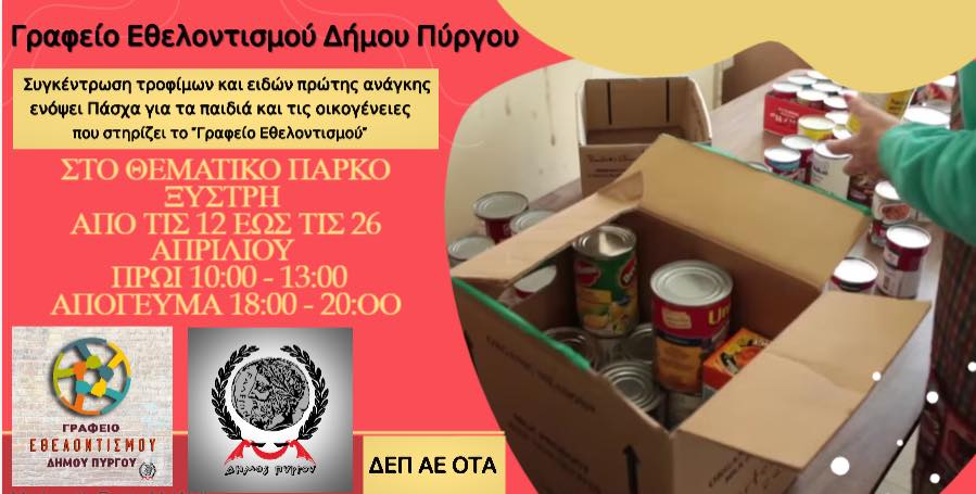 Το Γραφείο Εθελοντισμού του Δήμου Πύργου κινητοποιείται και φέτος ώστε να μπορέσει να καλύψει τις ανάγκες 80 περίπου οικογενειών που χρειάζονται βοήθεια. Βοηθός σε αυτή την σπουδαία πρωτοβουλία είστε όλοι εσείς όπου μπορείτε με ότι θέλετε να προσφέρετε να βοηθήσετε οικογένειες που δυστυχώς δεν έχουν τα βασικά λόγω της οικονομικής και υγειονομικής κατάστασης που βιώνουμε. Πολλοί συμπολίτες μας έχουν χάσει τις δουλειές τους και αδυνατούν να στηρίξουν τις οικογένειές τους. Σε αυτό μπορούμε όλοι να βοηθήσουμε προσφέροντας τροφές και προϊόντα μακράς διάρκειας όπως : Γάλα, Όσπρια, Αλεύρι, Ζάχαρη, Τοματοπολτο, Χαρτί υγείας, Σαπούνια ή όποιο άλλο τρόφιμο μπορείτε να προσφέρετε.