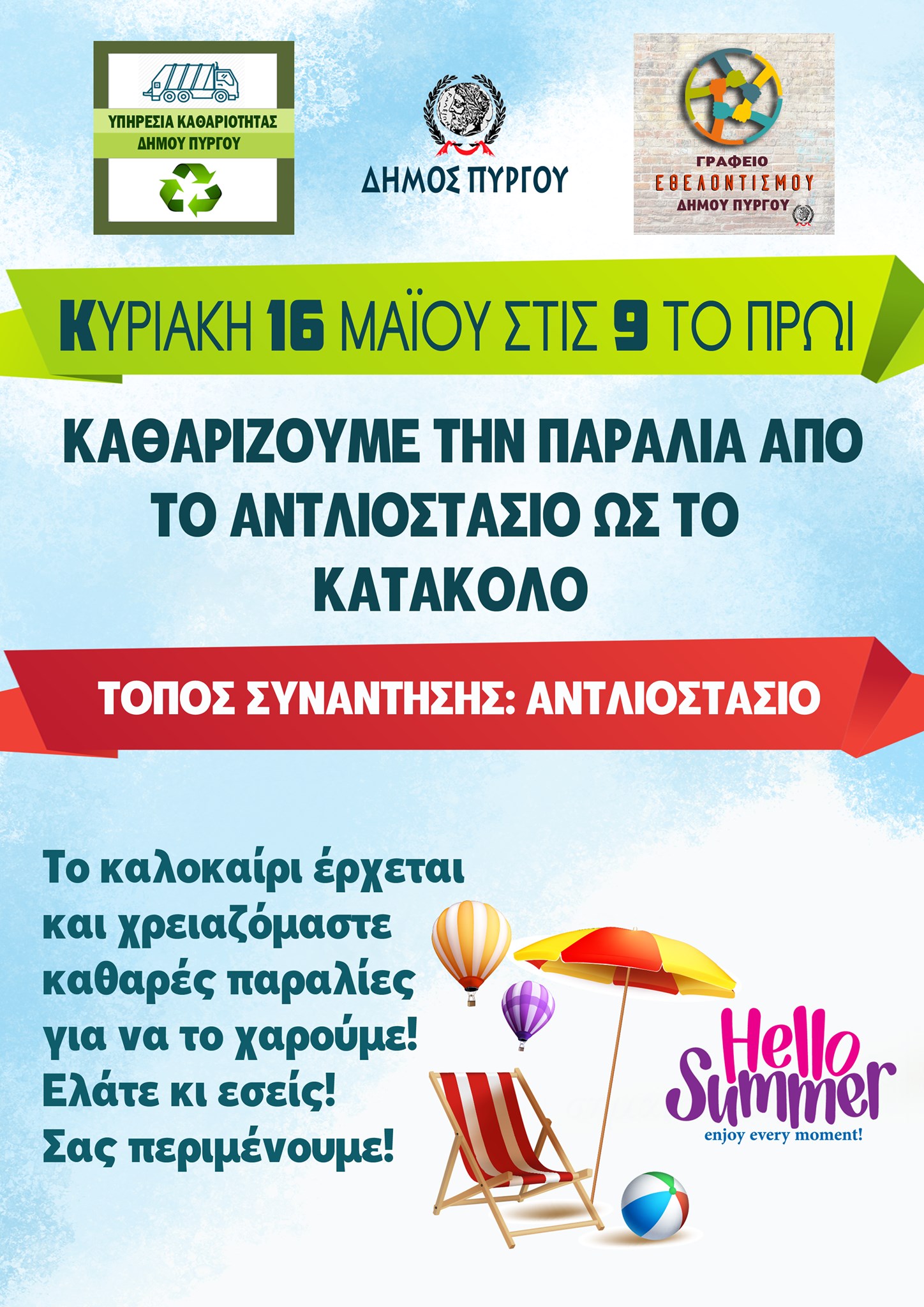 Αύριο Κυριακή 9 το πρωί, ο δήμος Πύργου σε συνεργασία με την Υπηρεσία Καθαριότητας και το Γραφείο Εθελοντισμού, θα καθαρίσουν τη παραλιακή ζώνη από το αντλιοστάσιο μέχρι και το Κατάκολο. Μια κίνηση συμβολική για την νέα καλοκαιρινή σεζόν, ώστε να ετοιμαστούν οι παραλίες μας για τους επισκέπτες και για εμάς. Η θάλασσα είναι δημόσιο αγαθό και καλό θα είναι να μην περιμένουμε μόνο τις αρμόδιες αρχές πότε θα καθαρίσουν. Θα πρέπει και εμείς ως πολίτες να είμαστε σωστοί. Όχι σκουπίδια στη παραλία, όχι τσιγάρα στην άμμο.