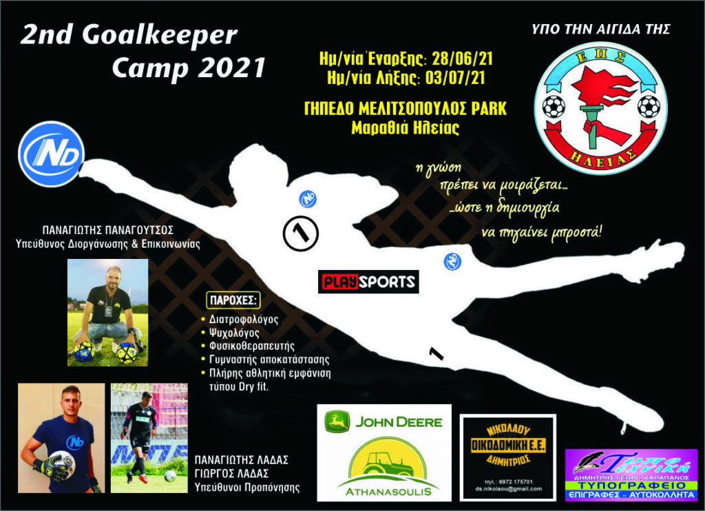 Εντείνεται το ενδιαφέρον, καθώς και η προετοιμασία, για το 2nd Goalkeeper Camp 2021 που θα λάβει προσεχώς χώρα, στον πανέμορφο και εξαιρετικά διαμορφωμένο ιδιωτικό χώρο του κ. Μελιτσόπουλου στη Μαραθιά Ηλείας (Μελιτσόπουλος Park) από τις 28/6 έως τις 3/7.