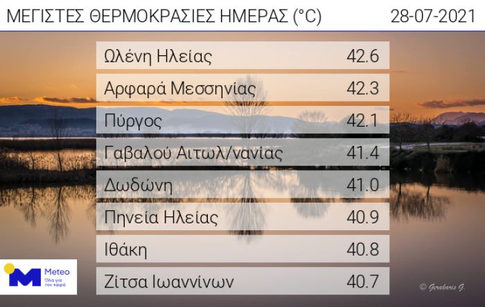 Πολύ υψηλές μέγιστες θερμοκρασίες επικράτησαν την Τετάρτη 28/07, με τον υδράργυρο να ξεπερνά τους 40 βαθμούς Κελσίου σε 16 μετεωρολογικούς σταθμούς του Εθνικού Αστεροσκοπείου Αθηνών/meteo.gr και να σπάει το φράγμα των 42 βαθμών στη Δυτική και Νότια Πελοπόννησο. Η Ηλεία πρωταγωνιστεί στις υψηλές θερμοκρασίες σε σχέση με άλλες περιοχές. Σήμερα αναμένονται εξίσου 40αρια ίσως και παραπάνω.