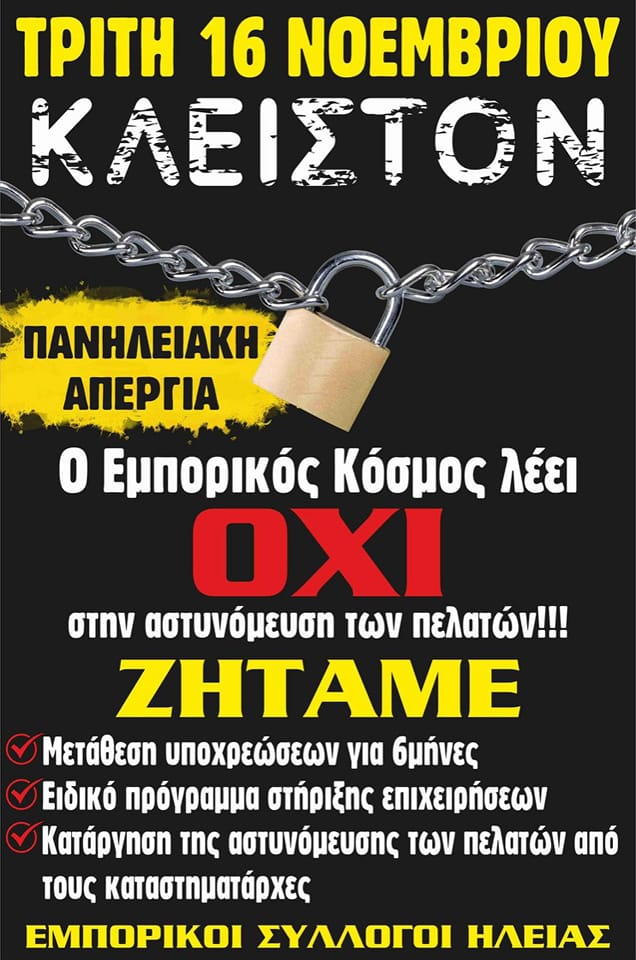 Ο Εμπορικός Σύλλογος Πύργου στην πρόσφατη ανοιχτή συνέλευση αποφάσισε το κλείσιμο των καταστημάτων στις 16-11-2021 μαζί με την Εστίαση, απόφαση που ακολουθούν με ανακοινώσεις τους και οι υπόλοιποι Εμπορικοί σύλλογοι της Ηλείας.