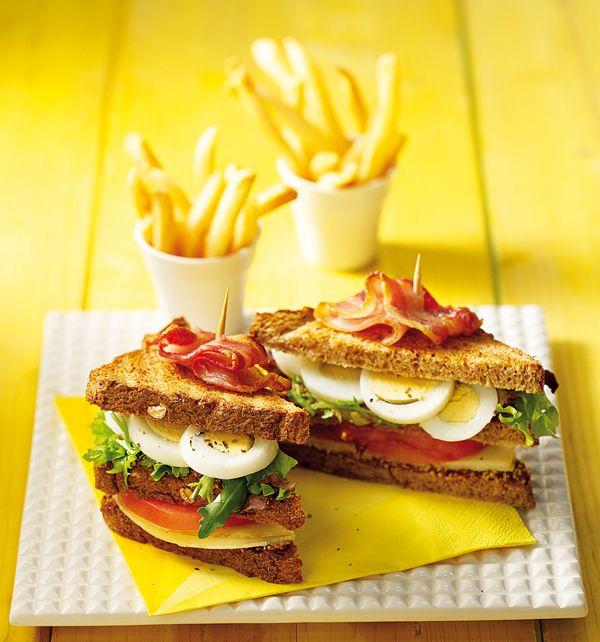 Κλαμπ σάντουϊτς με αβγό τυρί καπνιστό και τραγανό μπέικον