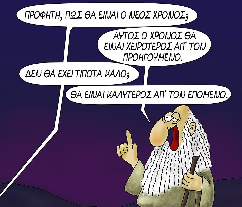 «Αυτό να στο αφήσω», λέει το 2021 στο 2022, στο ένα σκίτσο του Αρκά, κρατώντας τη μετάλλαξη Δέλτα, με το νέο έτος να απαντά το εξής: «Όχι, έχω δικό μου», κρατώντας τη νέα παραλλαγή του κορωνοϊού, τη μετάλλαξη Όμικρον.Στο άλλο σκίτσο, πρωταγωνιστής είναι ο «Προφήτης», μιλώντας για το πώς θα είναι ο νέος χρόνος.