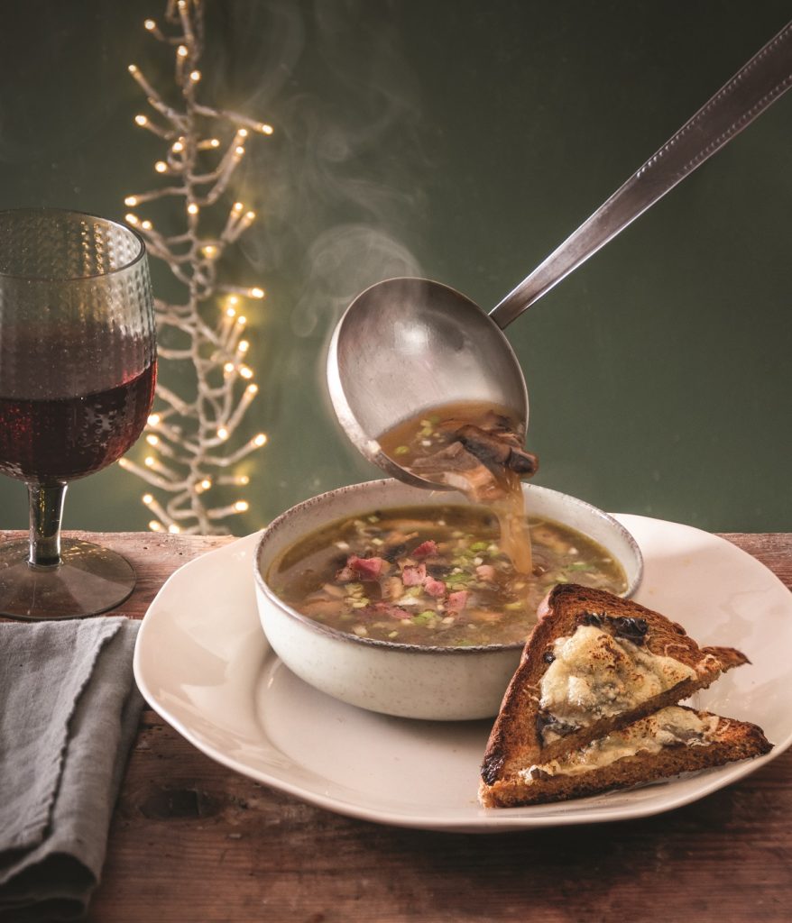 Διαυγής σούπα με άγρια μανιτάρια, απάκι, σέλινο και μπρουσκέτα με κασέρι και μαύρη τρούφα