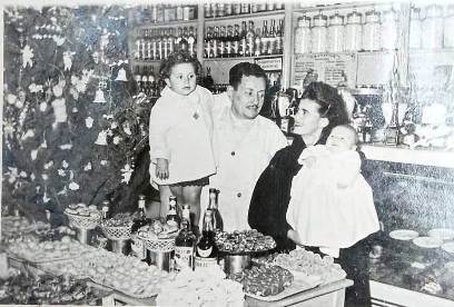 Στην φωτογραφία μέσα στο ζαχαροπλαστείο με όλα τα Χριστουγεννιάτικα καλούδια, ο Δημητρός Παντελίδης με την γυναίκα του Φιλιά και τα δύο παιδιά τους την Ελένη και το μωρό ο Γιάννης