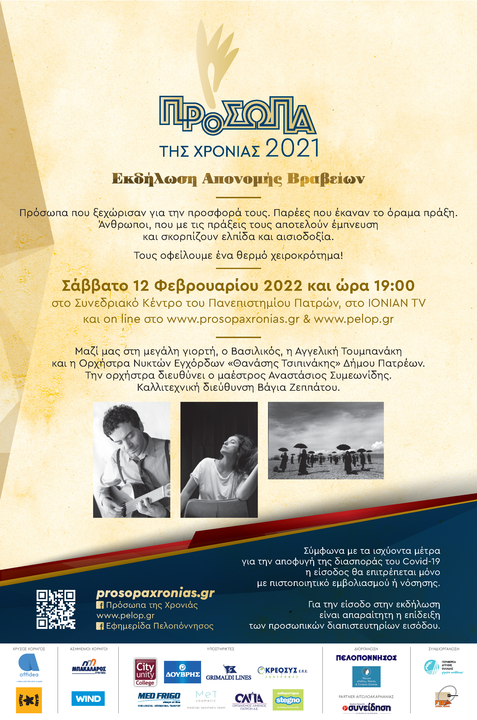 Η εκδήλωση θα παρουσιάζεται και ψηφιακά: IONIAN TV, https://www.youtube.com/user/PeloponnisosMedia, www.prosopaxronias.gr, www.pelop.gr και στα social media της εφημερίδας «ΠΕΛΟΠΟΝΝΗΣΟΣ» και των Προσώπων της Χρονιάς”.