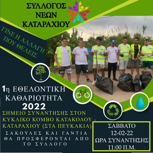 Με σύνθημα «βάλε κι εσύ ένα χεράκι», ο Σύλλογος νέων Καταραχίου, απευθύνει κάλεσμα σε όλους τους πολίτες και συλλόγους του δήμου Πύργου για μαζική ενεργοποίηση και συμμετοχή στην Εθελοντική Καθαριότητα της περιοχής και γειτονιών του Καταραχίου.