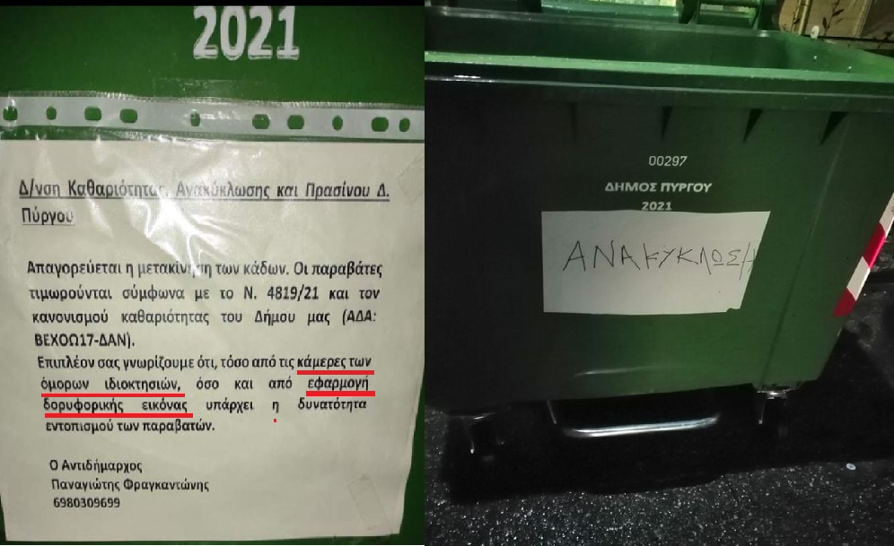 Αυτές τις ημέρες σε κάποιους κάδους υπάρχει κολλημένο πάνω ένα χαρτί που γράφει “Διεύθυνση Καθαριότητας, Ανακύκλωσης και Πρασίνου Δήμου Πύργου, Απαγορεύεται η μετακίνηση των κάδων. Οι παραβάτες τιμωρούνται. Επιπλέον σας γνωρίζουμε ότι τόσο από τις κάμερες των όμορων ιδιοκτησιών όσο και από εφαρμογή δορυφορικής εικόνας υπάρχει η δυνατότητα εντοπισμού των παραβατών.”