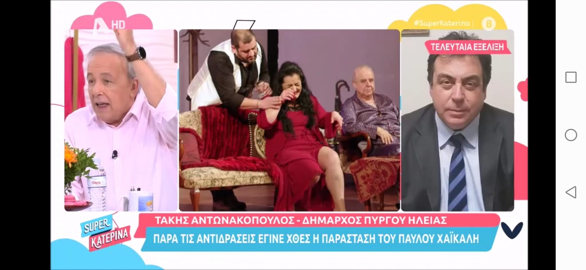 Χαμός έγινε σήμερα στην τηλεοπτική εκπομπή της Κατερίνας Καινούργιου που είχε καλέσει μέσω τηλεφώνου τον Δήμαρχο Πύργου κ. Π. Αντωνακόπουλο για να μιλήσει σχετικά με το θέμα που έχει προκύψει αυτές τις ημέρες με την θεατρική παράσταση του “Δούρειου Ίππου” όπου συμμετέχει ο Παύλος Χαϊκάλης. Όπως είναι γνωστό, ο Δήμαρχος Πύργου με τον Πρόεδρο του Δημοτικού Οργανισμού Πολιτισμού κ. Μικελόπουλο, αποφάσισαν να αφαιρέσουν την άδεια χρήσης του θεάτρου Απόλλων.
