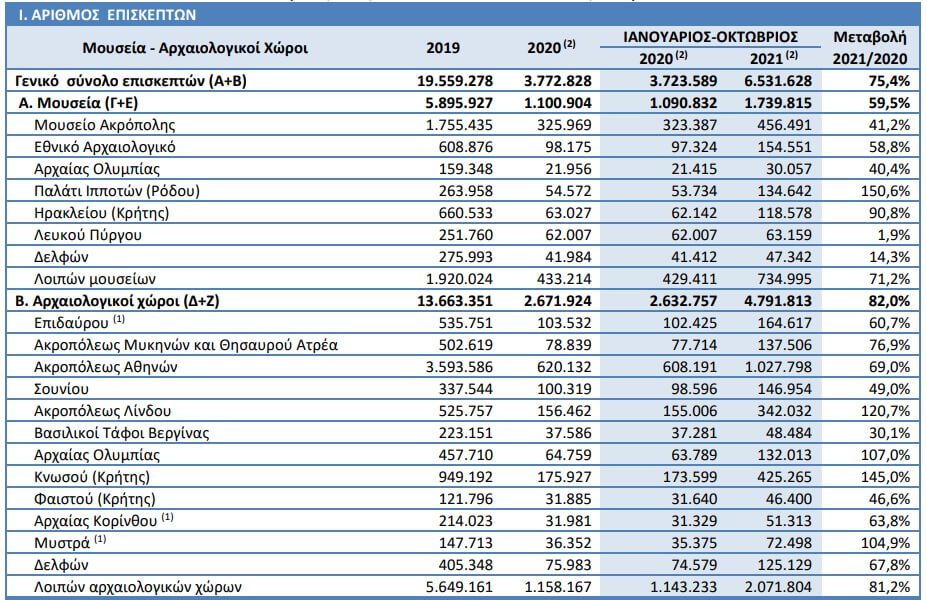 Στους αρχαιολογικούς χώρους το πρώτο δεκάμηνο του 2021, παρατηρείται αύξηση σε σχέση με το ίδιο διάστημα του 2020 κατά 82% στους επισκέπτες και κατά 145,2% στις εισπράξεις. Πρώτος σε επισκεψιμότητα αρχαιολογικός χώρος ήταν η Ακρόπολη και δεύτερη η Κνωσός, ενώ πρώτο σε επισκεψιμότητα μουσείο ήταν το μουσείο της Ακρόπολης και δεύτερο το Εθνικό Αρχαιολογικό Μουσείο στην Αθήνα.