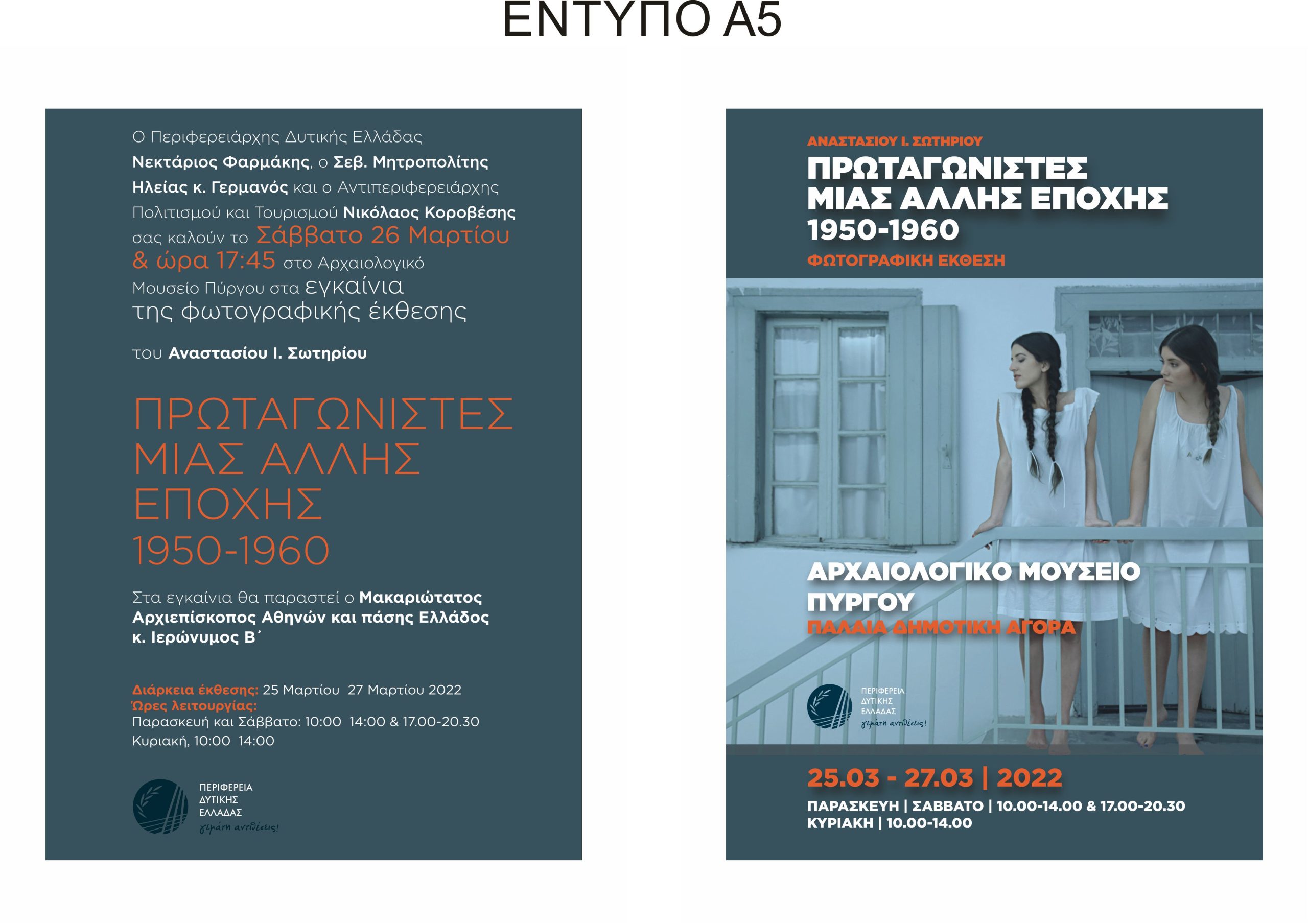 Η Περιφέρεια Δυτικής Ελλάδας και ο Ανιπεριφερειάρχης Πολιτισμού και Τουρισμού , κ. Νικ. Κοροβέσης , διοργανώνουν το Σάββατο 26 Μαρτίου 2022 και ώρα 17:45 στο Αρχαιολογικό Μουσείο του Πύργου τα εγκαίνια της φωτογραφικής έκθεσης “Πρωταγωνιστές μιας άλλης εποχής 1950-1960” του Αναστάσιου Σωτηρίου. Τα εγκαίνια της έκθεσης θα τελεστούν από τον Μακαριότατο Αρχιεπίσκοπο Αθηνών και Πάσης Ελλάδος κ.κ. Ιερώνυμο παρουσία του Μητροπολίτη Ηλείας κ.κ. Γερμανό, του Περιφερειάρχη Δυτ. Ελλάδας κ. Νεκτάριο Φαρμάκη , των Αντιπεριφερειαρχών, του Δημάρχου Πύργου και άλλων δημάρχων του νομού, των Ηλείων βουλευτών κλπ.
