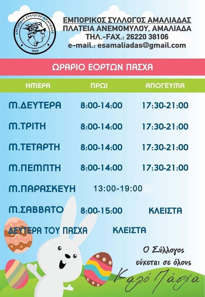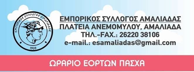 Το ειδικό εορταστικό ωράριο των καταστημάτων στην πόλη της Αμαλιάδας ανακοίνωσε ο Εμπορικός Σύλλογος της πόλης ενόψει των γιορτινών ημερών του Πάσχα