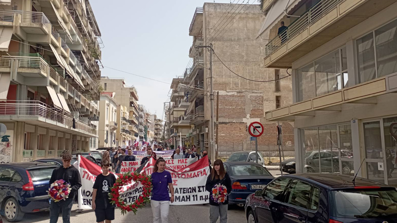 Από την κεντρική πλατεία, η πορεία με το κεντρικό πανό που ανέφερε «Τιμούμε την εργατική πρωτομαγιά με νέους αγώνες», κατευθύνθηκε με επικεφαλής τα στεφάνια που κρατούσαν παιδιά, στο μνημείο «Καλάκου» στον Πύργο, όπου κατατέθηκαν μαζί με λουλούδια, στη μνήμη του εκτελεσμένου εργάτη.