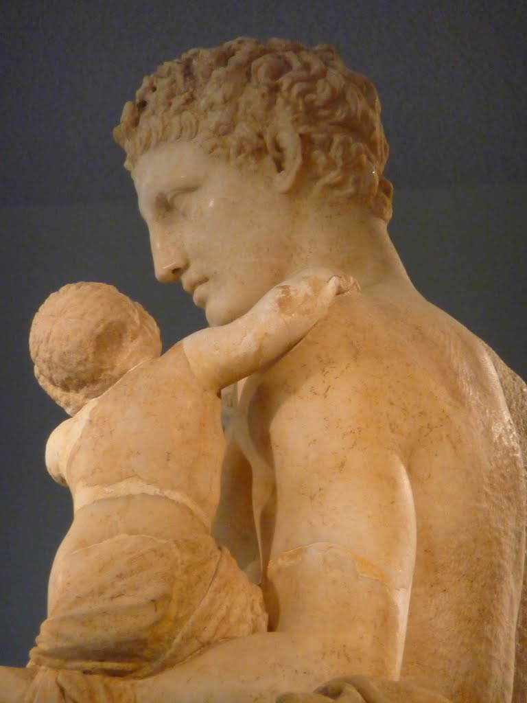 Το σύμπλεγμα (Ερμής φέρων τον Διόνυσον) κατασκευασμένο από παριανό μάρμαρο περί το 330 π.Χ. (κλασική περίοδος), απεικονίζει τον Ερμή που στηρίζεται σε κορμό δένδρου και κρατά στο αριστερό χέρι του το μικρό Διόνυσο.