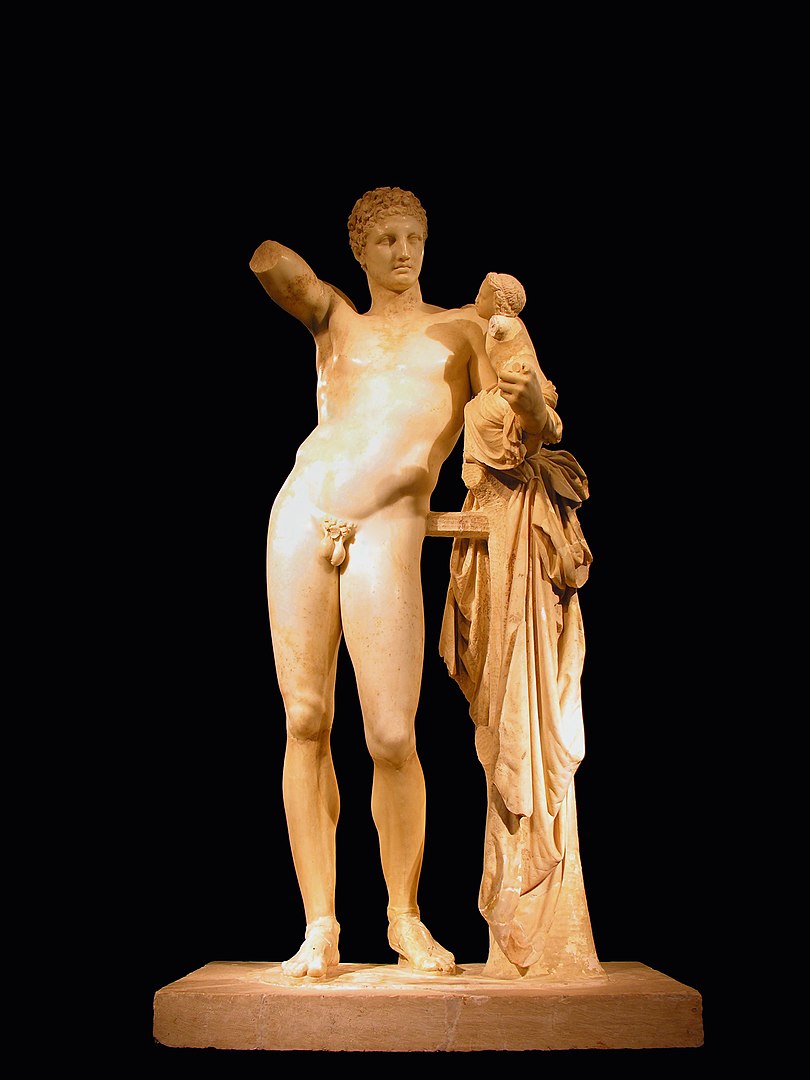 Όταν γεννήθηκε ο Διόνυσος, ο Δίας για να τον προστατέψει από την οργή της Ήρας, τον εμπιστεύθηκε στον Ερμή να τον μεταφέρει στις αδελφές της μητέρας του. Ο Πραξιτέλης (4ος αι. π.Χ.) απεικονίζει μία στιγμή ανάπαυσης του ταξιδιού. Στο δεξί χέρι που λείπει, πιθανόν ο Ερμής κρατούσε τσαμπί σταφύλι, σύμβολο του Διονύσου, που έδειχνε στο μικρό θεό. Είναι συμπληρωμένα το αριστερό πόδι από το γόνατο και κάτω, η δεξιά κνήμη και το κάτω μέρος του κορμού του δένδρου.