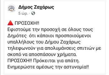Ο Δήμος Ζαχάρως με ανάρτησή του στην επίσημη σελίδα του στο Facebook ανακοίνωσε πως οι κάτοικοι του δήμου πρέπει να είναι υποψιασμένοι καθώς άγνωστοι προσποιούνται υπαλλήλους του δήμου και τηλεφωνούν για απολυμάνσεις σπιτιών με σκοπό να αποσπάσουν χρήματα. Πρόκειται για απάτη που έχουν στήσει εις βάρος των ανυποψίαστων πολιτών και υπάρχει κίνδυνος να χάσουν χρήματα.