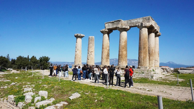 Πρώτη στάση ήταν η Αρχαία Κόρινθος, όπου οι μαθητές είχαν την ευκαιρία να επισκεφθούν τον Ναό του Απόλλωνα, ο οποίος χρονολογείται από τον 6ο αιώνα π. Χ. Ο Ναός, με τους έξι δωρικούς κίονες που σώζονται, εντυπωσίασε τους μαθητές και τους προσέφερε πολύτιμες πληροφορίες για τη θρησκευτική ζωή των αρχαίων Κορινθίων.