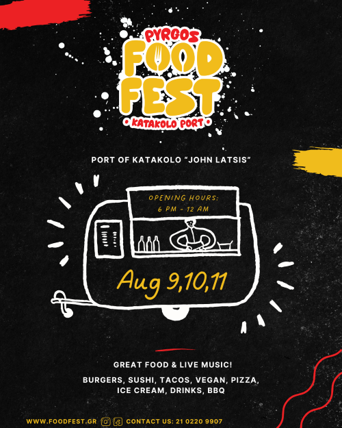 Το 2ο Pyrgos Food Fest θα πραγματοποιηθεί φέτος το τριήμερο 9, 10 και 11 Αυγούστου 2024, στο Λιμάνι του Κατακόλου «Ιωάννης Λάτσης», φέρνοντας μαζί του ένα κύμα γαστρονομικής απόλαυσης και μουσικής διασκέδασης.