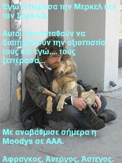Η τωρινή μου αξιολόγηση είναι ΑΑΑ και η προοπτική της αρνητική για να σας μιλήσω με τραπεζικούς όρους. Οπου ΑΑΑ σημαίνουν Ανεργος, Ατομο με ειδικές ανάγκες με 58% αναπηρία, Αγαμος. Η αρνητική προοπτική θα προσθέσει και ένα ακόμα Α από το Άπορος.