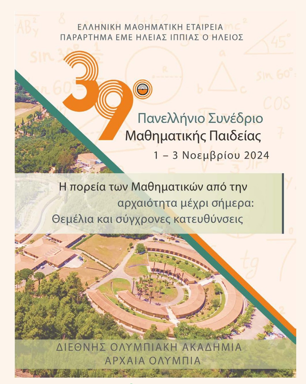 Το 39ο Πανελλήνιο Συνέδριο Μαθηματικής Παιδείας, με θέμα «Η πορεία των Μαθηματικών από την αρχαιότητα μέχρι σήμερα: Θεμέλια και σύγχρονες κατευθύνσεις», θα λάβει χώρα για πρώτη φορά στον Νομό Ηλείας, στην Αρχαία Ολυμπία στις εγκαταστάσεις της Διεθνούς Ολυμπιακής Ακαδημίας, από Παρασκευή 1-11-2024 έως και την Κυριακή 3-11- 2024.