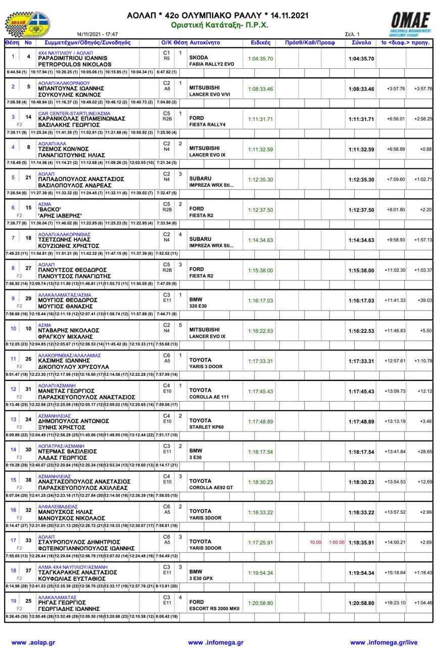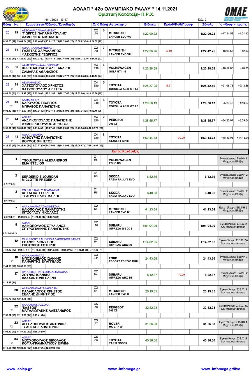 Ολοκληρώθηκε το 42ο Ολυμπιακό Ράλλυ που διεξήχθη την Κυριακή 14/11 στις ειδικές διαδρομές της Αλφειούσας, του Λάλα και της Φολόης, όλες με πολύ κόσμο να παρακολουθεί τον αγώνα που έριξε και την αυλαία του 57ου Πανελληνίου Πρωταθλήματος Ράλλυ.