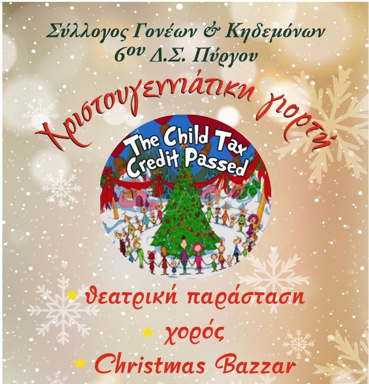 Μια ξεχωριστή Χριστουγεννιάτικη Γιορτή έχει ετοιμάσει και φέτος ο Σύλλογος Γονέων και Κηδεμόνων του 6 ου Δημοτικού Σχολείου Πύργου, με ανοιχτή πρόσκληση συμμετοχής, και ελεύθερη είσοδο, για όλα τα παιδιά και τους φίλους του σχολείου, που θέλουν περάσουν ένα απόγευμα γεμάτο με «Χριστούγεννα».