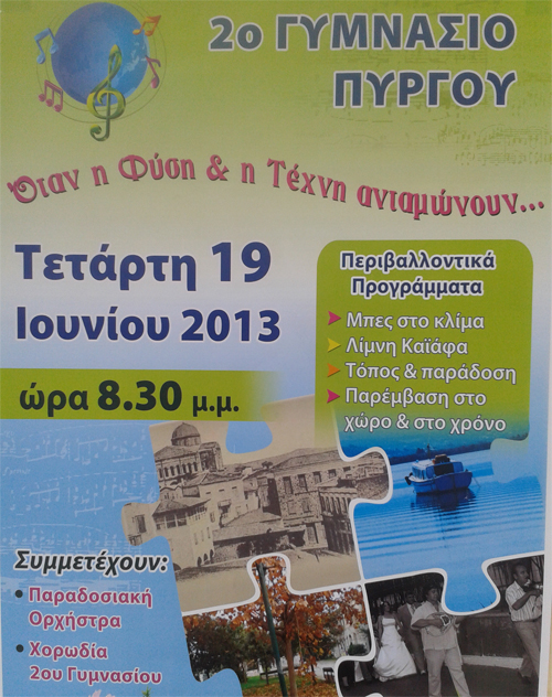 Μια πολύ όμορφη εκδήλωση παρουσιάσουν σήμερα, Τετάρτη 19 Ιουνίου στις 20:30 , σε συνεργασία με τους καθηγητές τους οι μαθητές του 2ου Γυμνασίου Πύργου.
