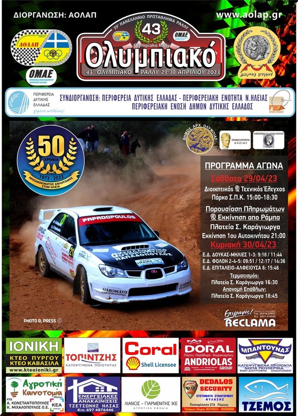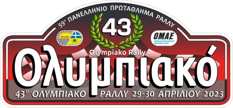 Το Πανελλήνιο Πρωτάθλημα Ράλλυ Χώματος ξεκινάει με το 43ο Ολυμπιακό Ράλλυ, το οποίο θα διεξαχθεί στις 29 και 30 Απριλίου 2023, από το αθλητικό Σωματείο Αγωνιστική Ολυμπιακή Λέσχη Αυτοκινήτου Πύργου (Α.Ο.Λ.Α.Π.). Συνδιοργανωτές του αγώνα είναι η Περιφέρεια Δυτικής Ελλάδος (Περιφερειακή Ενότητα Ηλείας), η Π.Ε.Δ.Δ.Ε (Περιφερειακή Ένωση Δήμων Δυτικής Ελλάδος), ο Δήμος Πύργου και ο Δήμος Αρχαίας Ολυμπίας. Θεσμικοί υποστηρικτές είναι η ΔΗΚΕ Πύργου, το Επιμελητήριο Ηλείας και ο Εμπορικός Σύλλογος Πύργου, Ερμής.