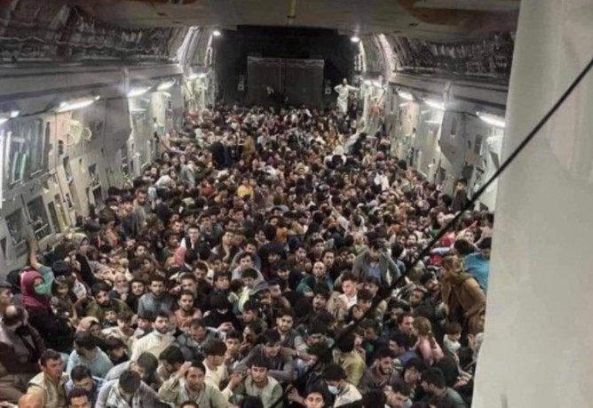 Χαρακτηριστική του όγκου του πλήθους που προσπαθεί απεγνωσμένα να εγκαταλείψει το Αφγανιστάν τα τελευταία 24ωρα είναι μια φωτογραφία που κάνει τον γύρο του διαδικτύου. Σε αυτή απεικονίζονται περισσότεροι από 600 Αφγανοί και Αφγανές «στοιβαγμένοι» σε ένα πελώριο φορτηγό αεροσκάφος της Αμερικανικής Πολεμικής Αεροπορίας, το οποίο αναχώρησε από το διεθνές αεροδρόμιο της Καμπούλ το βράδυ της Κυριακής.