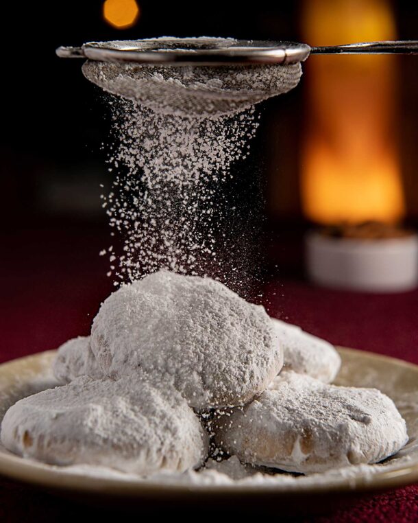 - Βγάζουμε από τον φούρνο, αφήνουμε να κρυώσουν πολύ καλά και τους βουτάμε σε μπόλικη άχνη. Τους τοποθετούμε σε πιατέλα, σε στρώσεις και κάθε στρώση που βάζουμε, πασπαλίζουμε με έξτρα άχνη.