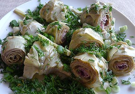 Χοντροκόβουμε τις καρδιές μαρουλιού και τις βάζουμε περιμετρικά σε μια πιατέλα σερβιρίσματος. Τοποθετούμε τις αγκινάρες και τη μαραθόριζα, περιχύνουμε με το dressing και σερβίρουμε αμέσως.