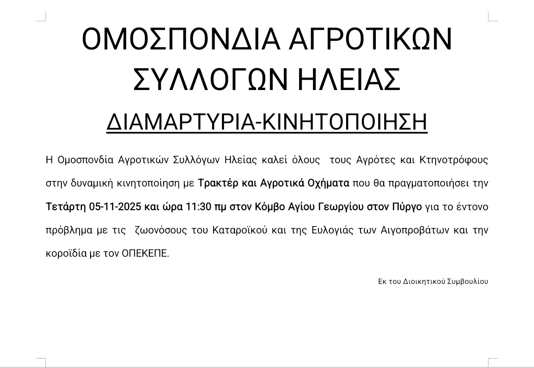 ΤΙ ΑΝΑΦΕΡΕΙ Η ΟΜΟΣΠΟΝΔΙΑ ΑΓΡΟΤΙΚΩΝ ΣΥΛΛΟΓΩΝ ΗΛΕΙΑΣ ΓΙΑ ΤΗΝ ΔΙΑΜΑΡΤΥΡΙΑ-ΚΙΝΗΤΟΠΟΙΗΣΗ