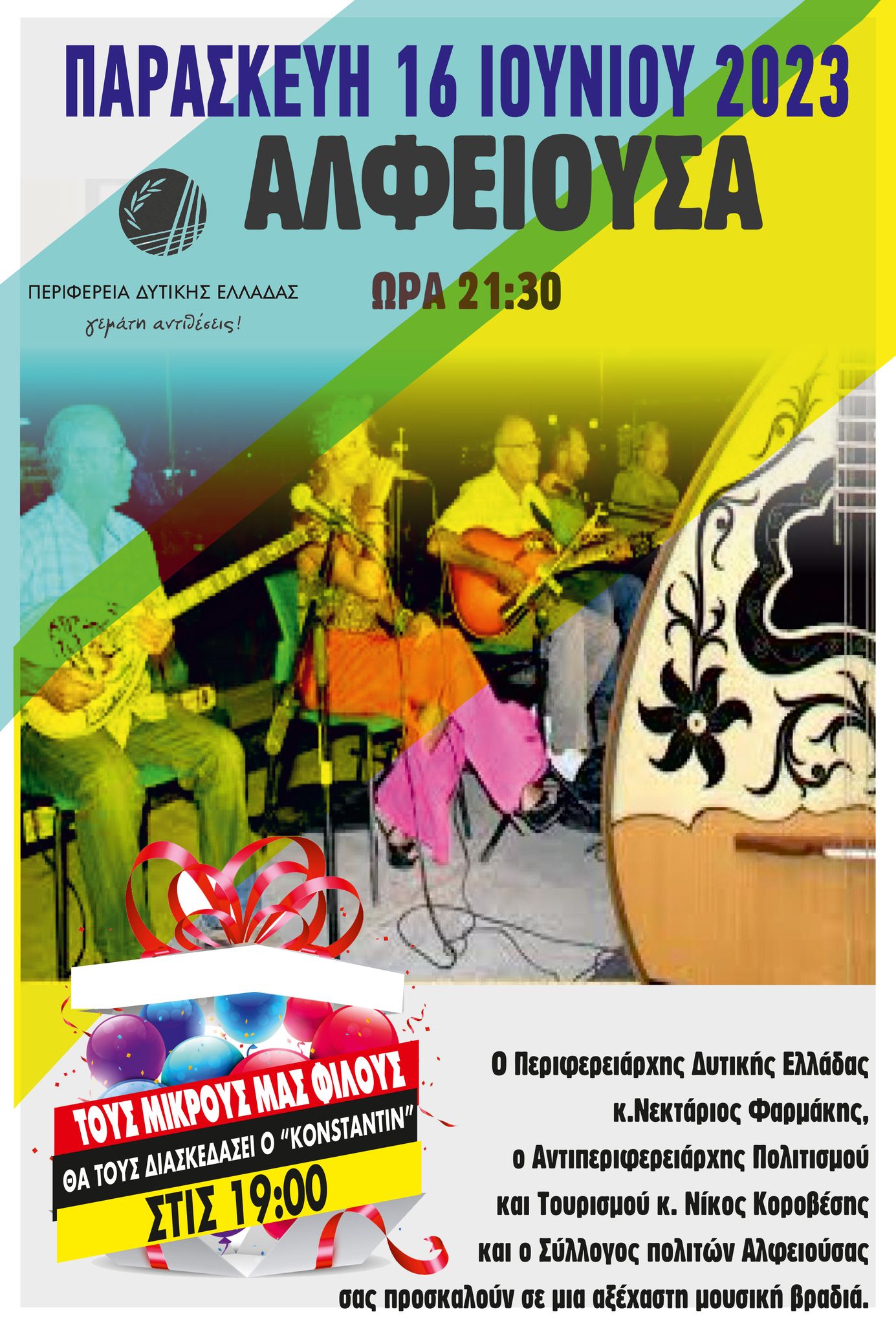Νωρίτερα, στις 7 το απόγευμα, με αφορμή την λήξη της σχολικής χρονιάς, ο Σύλλογος Πολιτών Αλφειούσας έχει προσκαλέσει τον μάγο Konstadin για να διασκεδάσει τα παιδιά, αποχαιρετώντας με τον τρόπο αυτό τους τελειόφοιτους μαθητές του δημοτικού που από το Σεπτέμβρη