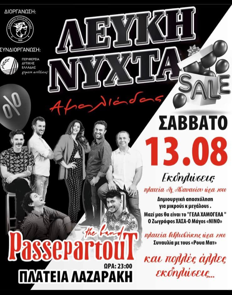 Την στήριξη του στον εμπορικό κόσμο της Αμαλιάδας, εκφράζει το τμήμα Πολιτισμού της Περιφέρειας Δυτικής Ελλάδας που στο πλαίσιο της 4ης ΛΕΥΚΗΣ ΝΥΧΤΑΣ του Εμπορικού Συλλόγου Ήλιδας, που διοργανώνει σε συνεργασία με τον Εμπορικό Σύλλογο, το Σάββατο 13 Αυγούστου μια μεγάλη συναυλία με το συγκρότημα PASSEPARTOUT στην πλατεία Λαζαράκη, στις 11 το βράδυ. Ένα ξέφρενο πάρτι για όλον τον κόσμο που θα μπορεί να διασκεδάσει και να χορέψει στους ρυθμούς της σύγχρονης μουσικής και με το οποίο θα κλείσουν οι εκδηλώσεις της Λευκής Νύχτας.