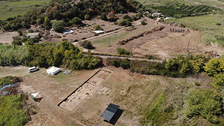 Επίσης, αποκαλύφθηκε και τεκμηριώθηκε η πορεία ισχυρού τοίχου, που είχε εντοπίσει ήδη ο Wilhelm Dörpfeld στις αρχές του 20ού αιώνα. Ο τοίχος πιθανώς αποτελεί το βόρειο άκρο του περιβόλου του ιερού του Ποσειδώνα. Σημαντική υπήρξε η συμβολή της Περιφέρειας Δυτικής Ελλάδας, που ανέλαβε τον καθαρισμό της περιοχής βόρεια του ναού από την πυκνή βλάστηση. Οι αρχαιολογικές εργασίες χρηματοδοτούνται από το Ίδρυμα Gerda Henkel και το Αυστριακό Αρχαιολογικό Ινστιτούτο της Αυστριακής Ακαδημίας Επιστημών. Τα επόμενα χρόνια η επιστημονική ομάδα σκοπεύει να συνεχίσει την έρευνα, ώστε να εντοπίσει περισσότερα στοιχεία για την έκταση και τη μορφή του ιερού και την τοπογραφία της περιοχής.