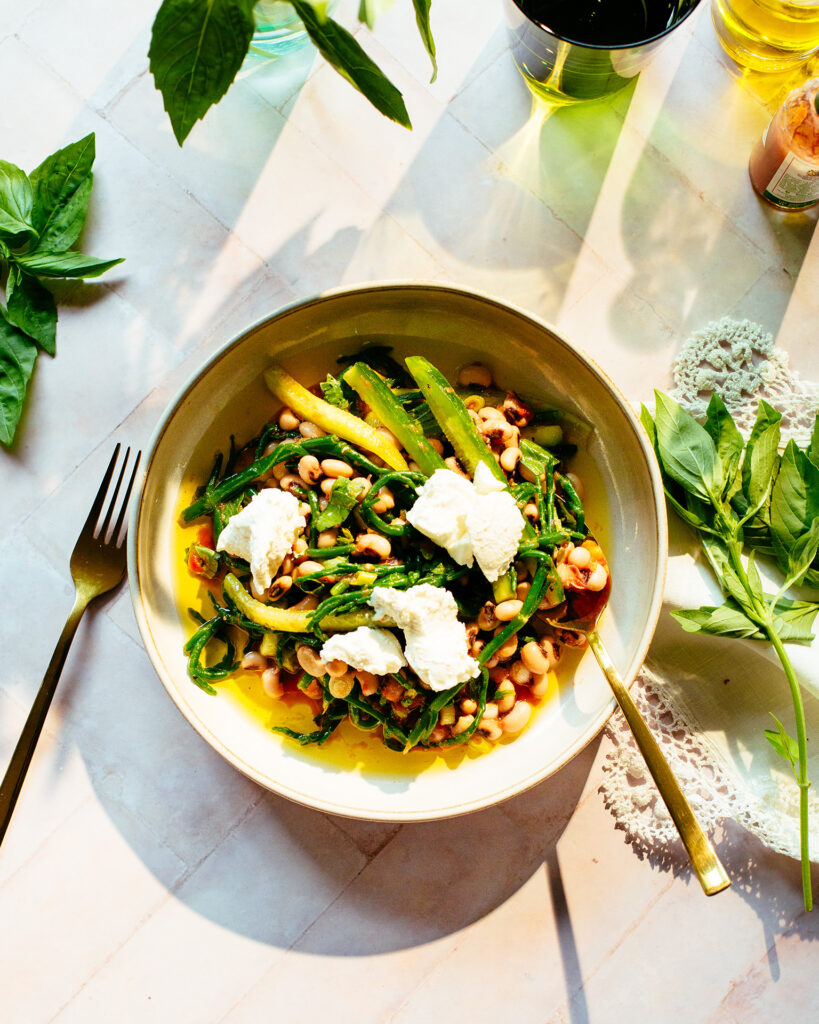 Φασολάκια με αγγούρι και ψητό μοσχάρι