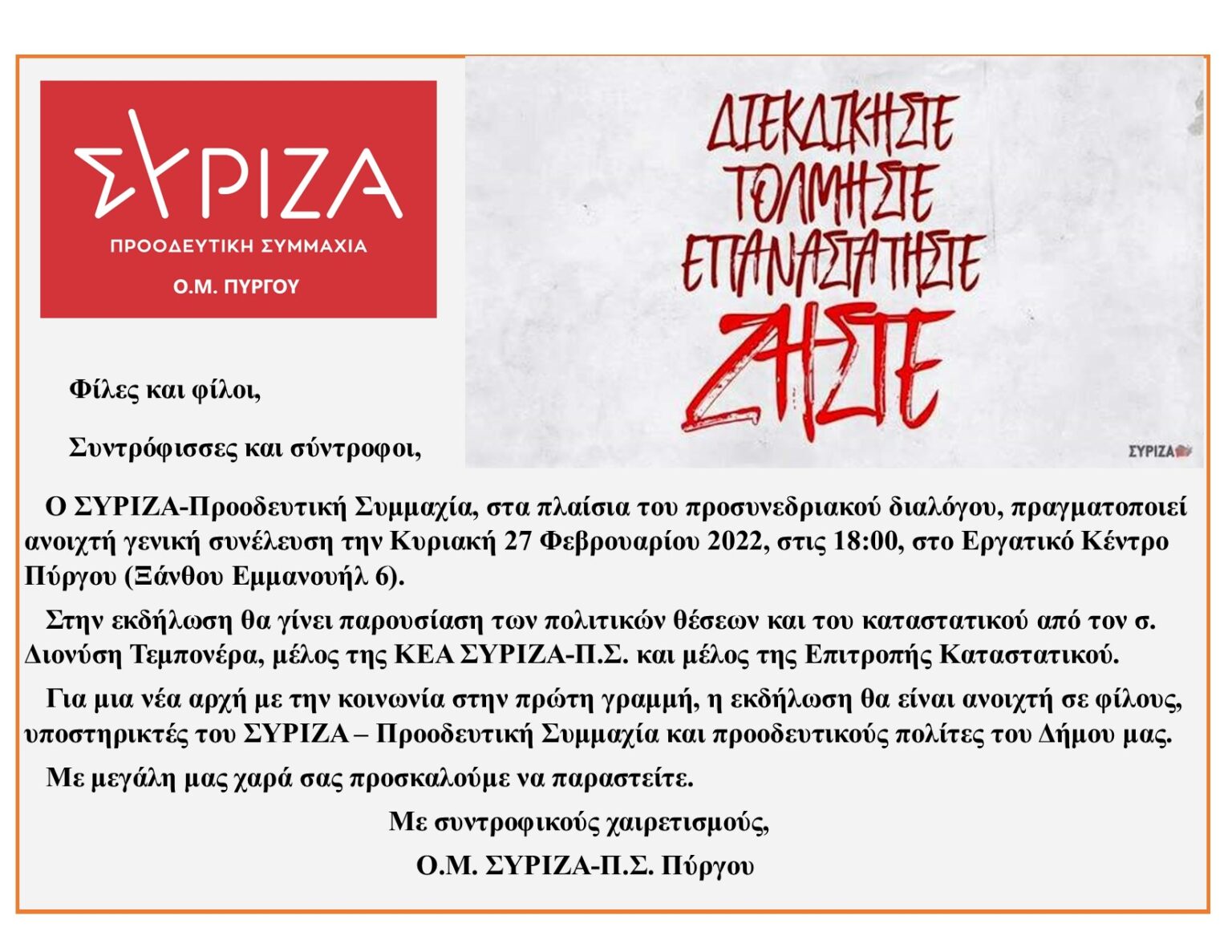 Ανοιχτή γενική συνέλευση της Ο.Μ. ΣΥΡΙΖΑ – Π.Σ. Πύργου την Κυριακή (27/2)