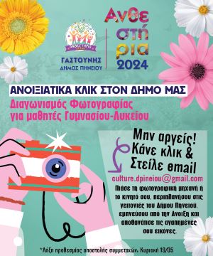 Εάν είσαι μαθητής / μαθήτρια Γυμνασίου ή Λυκείου, μην χάνεις χρόνο! Ο Δήμος Πηνειού στο πλαίσιο των Ανθεστηρίων Γαστούνης 2024 σε προσκαλεί να συμμετάσχεις στον Διαγωνισμό Φωτογραφίας που διοργανώνει με θέμα «Ανοιξιάτικα κλικ στο Δήμο μας»