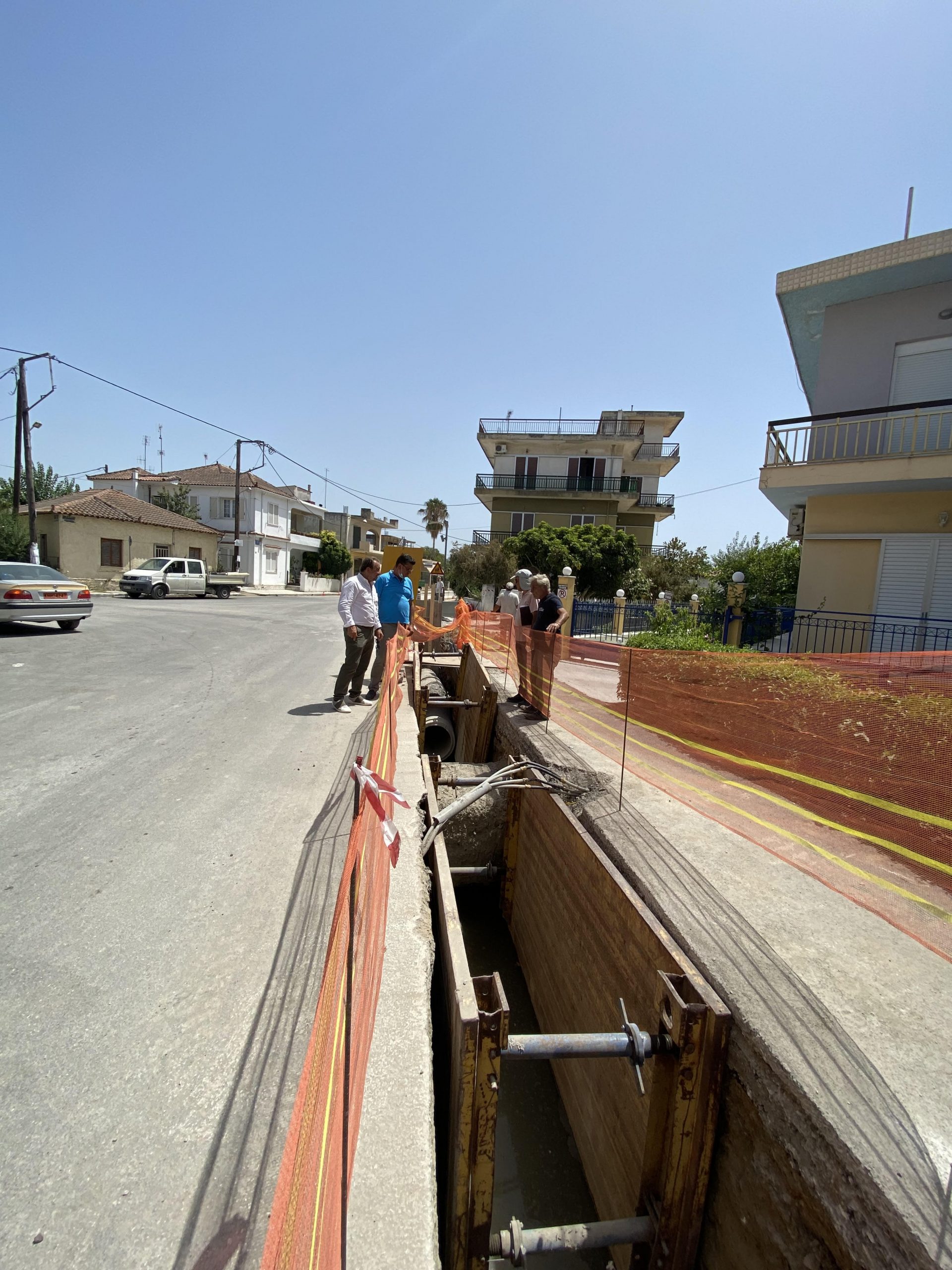Ενώ ταυτόχρονα πραγματοποιείται εγκιβωτισμός των τσιμέντο-σωλήνων και αποκατάσταση των κατεστραμμένων ασφαλτικών που προέκυψαν από τις εκσκαφές. Κατά μήκος της όδευσης θα τοποθετηθούν φρεάτια και εσχάρες συλλογής ομβρίων.
