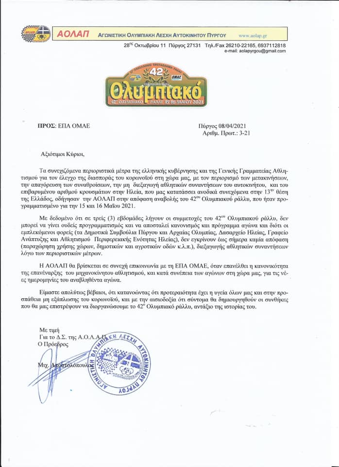 “Υπό άλλες συνθήκες θα ανακοινώναμε τα νέα του αγώνα και σε τρεις εβδομάδες θα έληγαν οι συμμετοχές. Δυστυχώς η κατάσταση είναι ακόμα πολύ δύσκολη, ως εκ τούτου δεν μπορεί οργανωτικά να προχωρήσει οποιαδήποτε ενέργεια. Γι’ αυτό το λόγο στάλθηκε η παρακάτω επιστολή στην ΕΠΑ ΟΜΑΕ που αφορά την αναβολή του 42ου Ολυμπιακού Ράλλυ. Αμέσως μόλις υπάρξουν νεότερα θα ανακοινωθεί και η νέα ημερομηνία του αγώνα. Θέλουμε να ευχαριστήσουμε θερμά όλους εσάς που ενδιαφερθήκατε και όλο αυτό το διάστημα μας ρωτάτε για τον αγώνα. Ευχόμαστε το συντομότερο δυνατό να είμαστε όλοι σε πολύ καλύτερη κατάσταση και να ξανά ανταμώσουμε στα βουνά μας!”