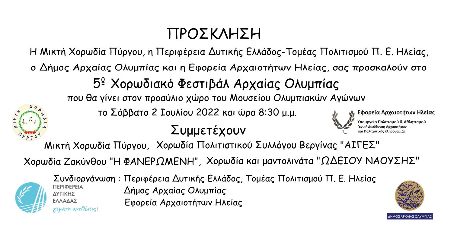 Η Μικτή Χορωδία Πύργου πιστή στους σκοπούς της ίδρυσής της, που είναι η ανάπτυξη και προώθηση των μουσικών επιδιώξεων των μελών της, διοργανώνει μετά από δύο χρόνια αποχής, αφού οι συνθήκες δεν το επέτρεπαν, το 5ο Χορωδιακό Φεστιβάλ Αρχαίας Ολυμπίας.