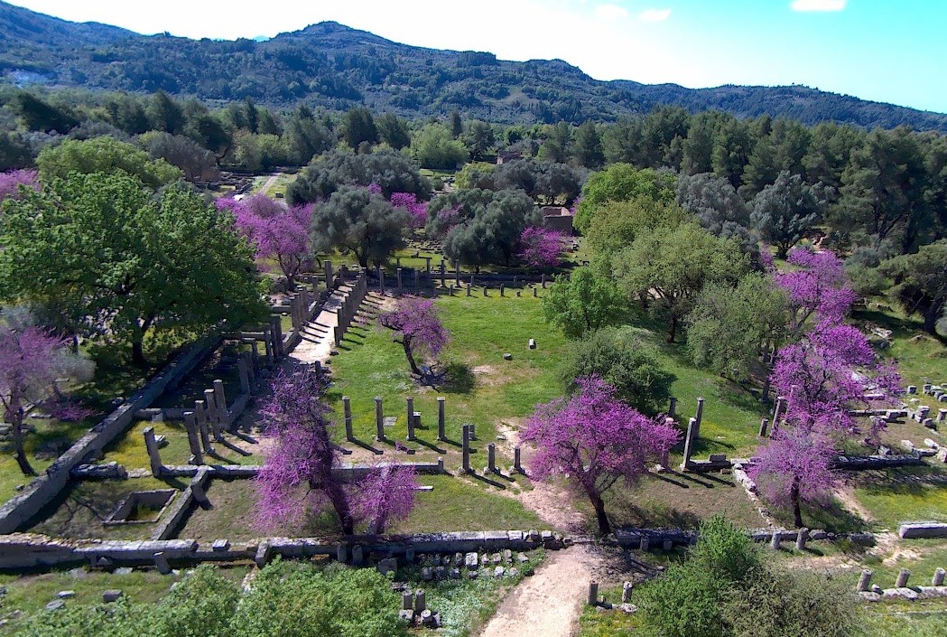 Κάθε άνοιξη, ο αρχαιολογικός χώρος της Αρχαίας Ολυμπίας αποκτά ξεχωριστή ομορφιά, καθώς ανάμεσα στους κίονες από ιερό κογχυλιάτη και στα αιωνόβια δέντρα, ξεχωρίζει το δέντρο της κουτσουπιάς.