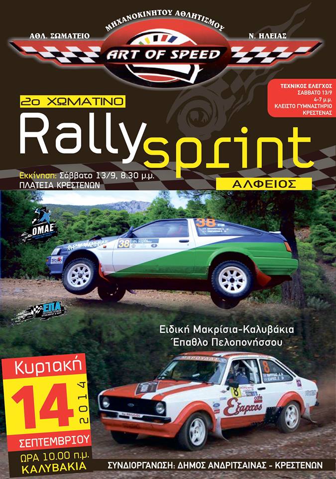 H Art Of Speed (Αθλ. Σωματείο Μηχανοκίνητου Αθλητισμού Ν. Ηλείας) διοργανώνει το 2ο ΡΑΛΛΥ ΣΠΡΙΝΤ ΑΛΦΕΙΟΣ, στην ειδική διαδρομή «Μακρίσια – Καλυβάκια» στις 13 και 14 Σεπτεμβρίου.