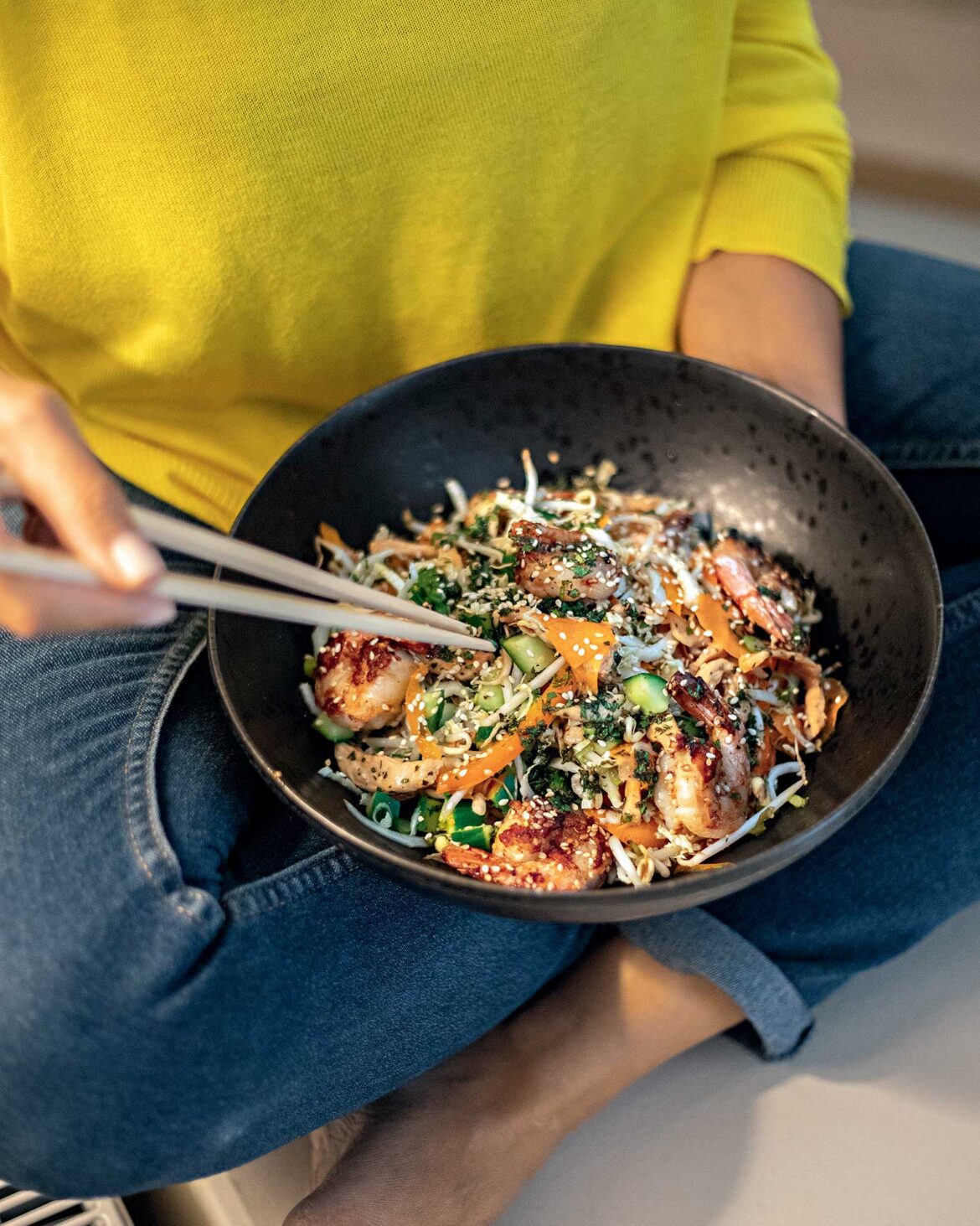 - Σκουπίζουμε το τηγάνι και ζεσταίνουμε το σησαμέλαιο σε δυνατή φωτιά. Σοτάρουμε τις γαρίδες για 1 λεπτό από την κάθε πλευρά, ίσα ίσα να αλλάξουν χρώμα. Αλατοπιπερώνουμε και αποσύρουμε.