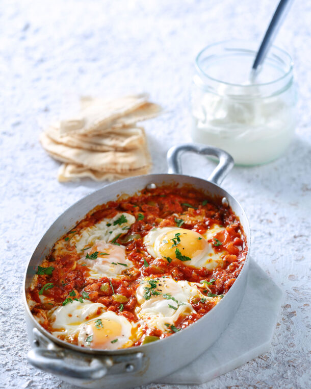 - Σερβίρουμε τα αυγά με τη σάλτσα τους, γιαούρτι και αραβικές πίτες ή ψωμί.