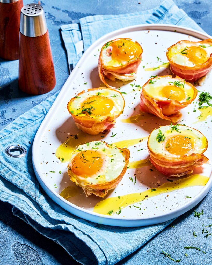 - Φουρνίζουμε και ψήνουμε για 30 λεπτά, μέχρι να σφίξουν τα ασπράδια και να ροδίσουν απαλά οι άκρες του μπέικον.