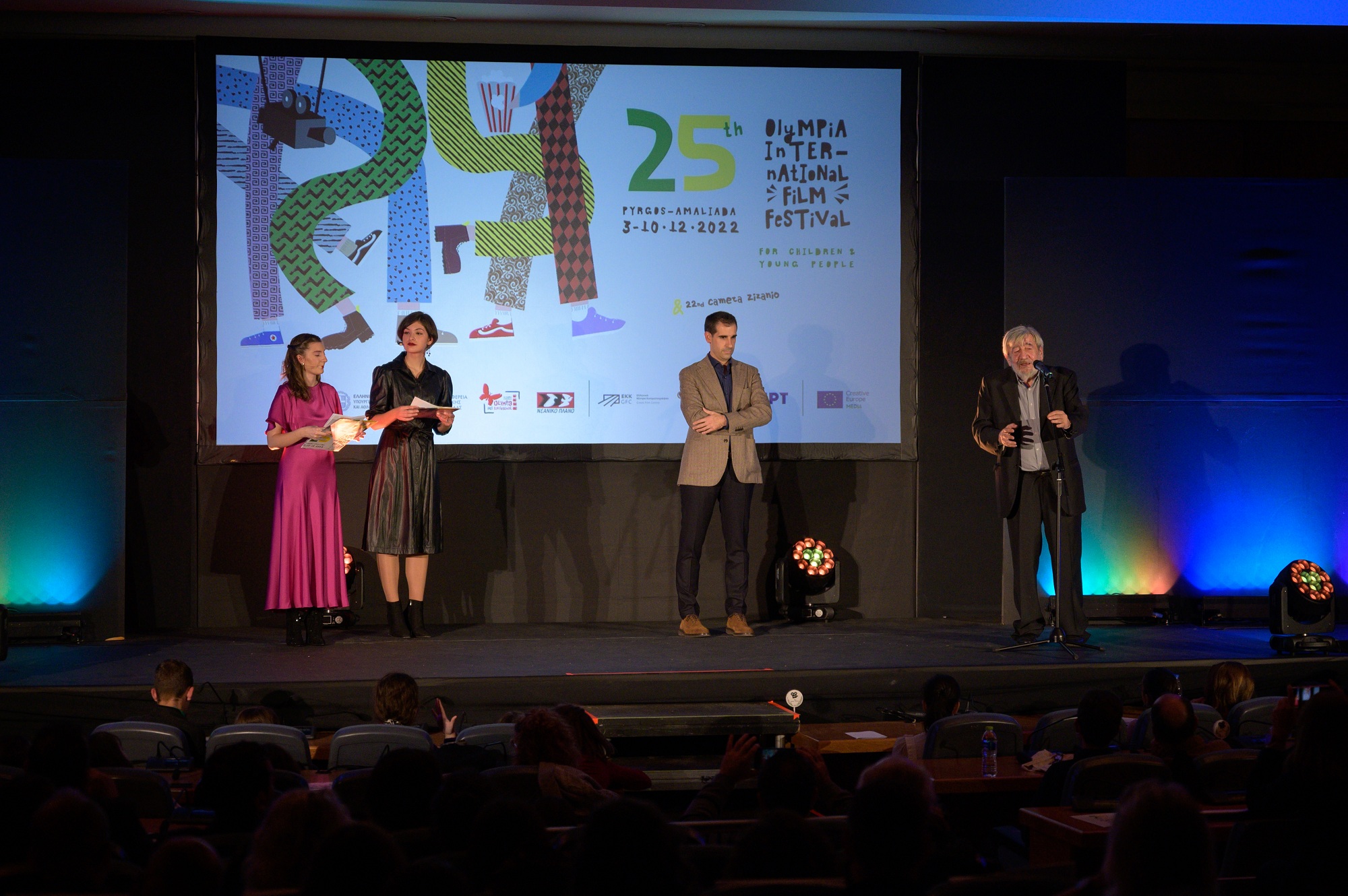Παίρνοντας τον λόγο, ο Δημήτρης Σπύρου, «ψυχή» του Φεστιβάλ Ολυμπίας, ευχαρίστησε τους δημιουργούς των ταινιών, ενώ εξέφρασε την ικανοποίησή του που για πρώτη φορά φέτος υπήρχαν σε όλα τα διαγωνιστικά τμήματα (εκτός από τις μεγάλου μήκους ταινίες) ελληνικές συμμετοχές, «και μάλιστα εξαιρετικές υποψηφιότητες. Ξεκινώντας αυτό το Φεστιβάλ το 1997, μια από τις βασικές παραμέτρους που θέσαμε ήταν  η ανάπτυξη της παραγωγής και της διανομής ελληνικών  παιδικών ταινιών. Την πρώτη χρονιά είχαμε μια ελληνική ταινία του Μένου Δελιοτζάκη, την ταινία του “Στο δάσος”, αλλά ακολούθησαν χρονιές που δεν είχαμε καμία. Αγαπάμε το ελληνικό σινεμά, αλλά το επίπεδό των ταινιών που παίζει ένα διεθνές φεστιβάλ πρέπει να είναι αυτό που πρέπει. Σήμερα, υπάρχει μια σαφής στροφή, και σε αυτό συνετέλεσε και το ΕΚΚ που καθιέρωσε ένα ειδικό μπόνους γι’αυτές τις ταινίες. Για πρώτηφορά φέτος είδαμε να βραβεύεται μία ελληνική ταινία μεγάλου μήκους: το ντοκιμαντέρ Τέλος Χρόνουτου Λουκά Παλαιοκρασσά. Μια ταινία που δεν έχει να ζηλέψει τίποτα από τις ξένες».