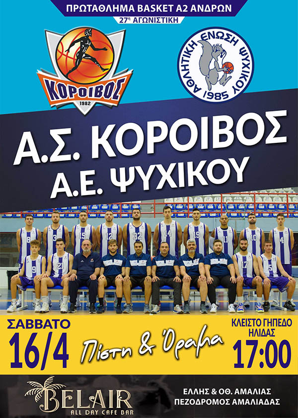 Για το πρωτάθλημα μπάσκετ της Α2 Εθνικής κατηγορίας, το απόγευμα του Σαββάτου (16/4) ο Κόροιβος Αμαλιάδας αντιμετώπισε εντός έδρας στο κλειστό Ήλιδας την Α.Ε. Ψυχικού, σε ματς για την 27η αγωνιστική και ηττήθηκε στην παράταση με με 73-75 (66-66 καν. αγ.)